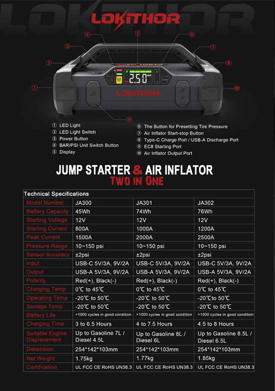 以上三種點(diǎn)火器都是JA產(chǎn)品,“JA”中的“J”代表跳躍啟動(dòng)器,而“A”代表充氣器。這三個(gè)產(chǎn)品可以滿足不同的規(guī)格要求,參數(shù)可以參考下面的圖片(當(dāng)然,來(lái)到現(xiàn)場(chǎng)近距離了解,會(huì)有更好更多的美好體驗(yàn))。